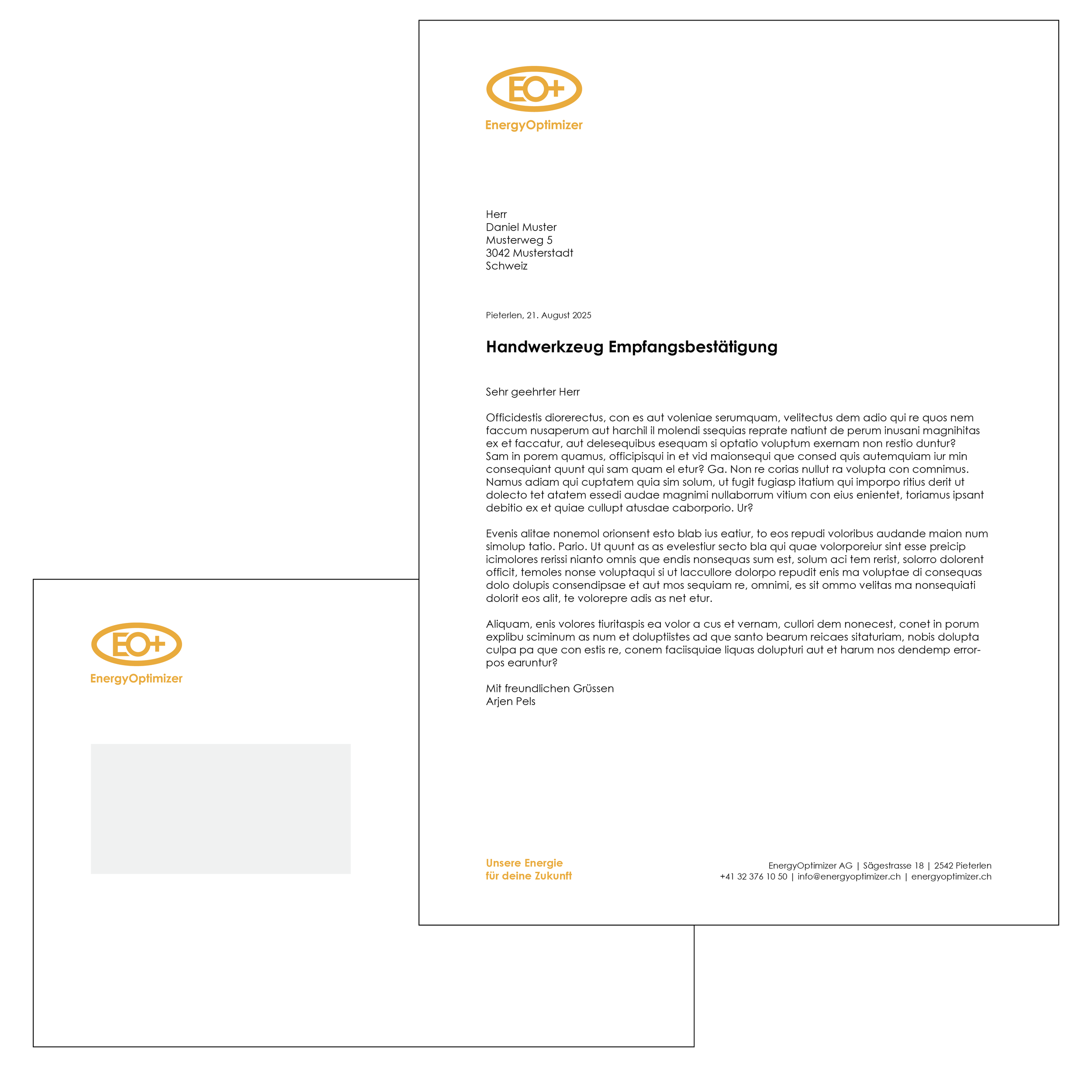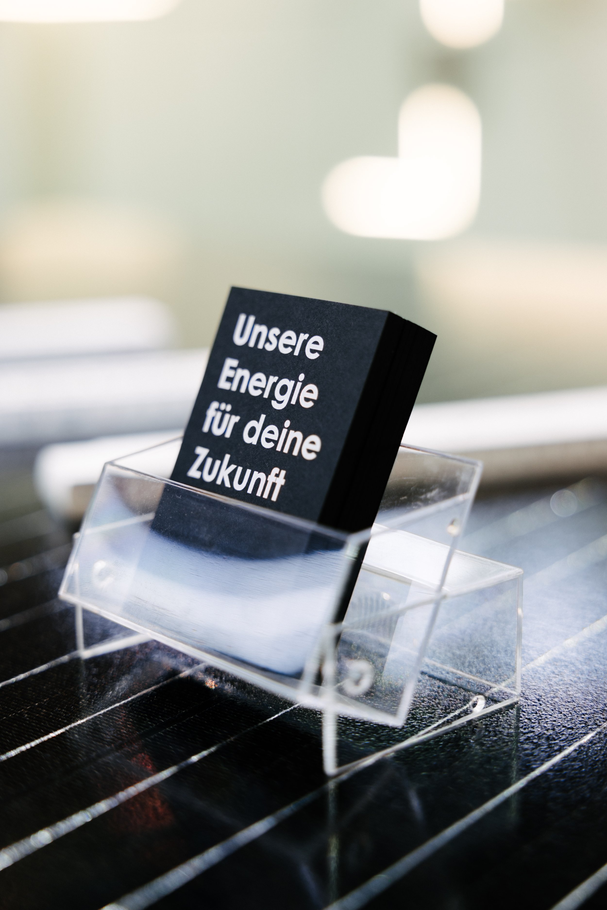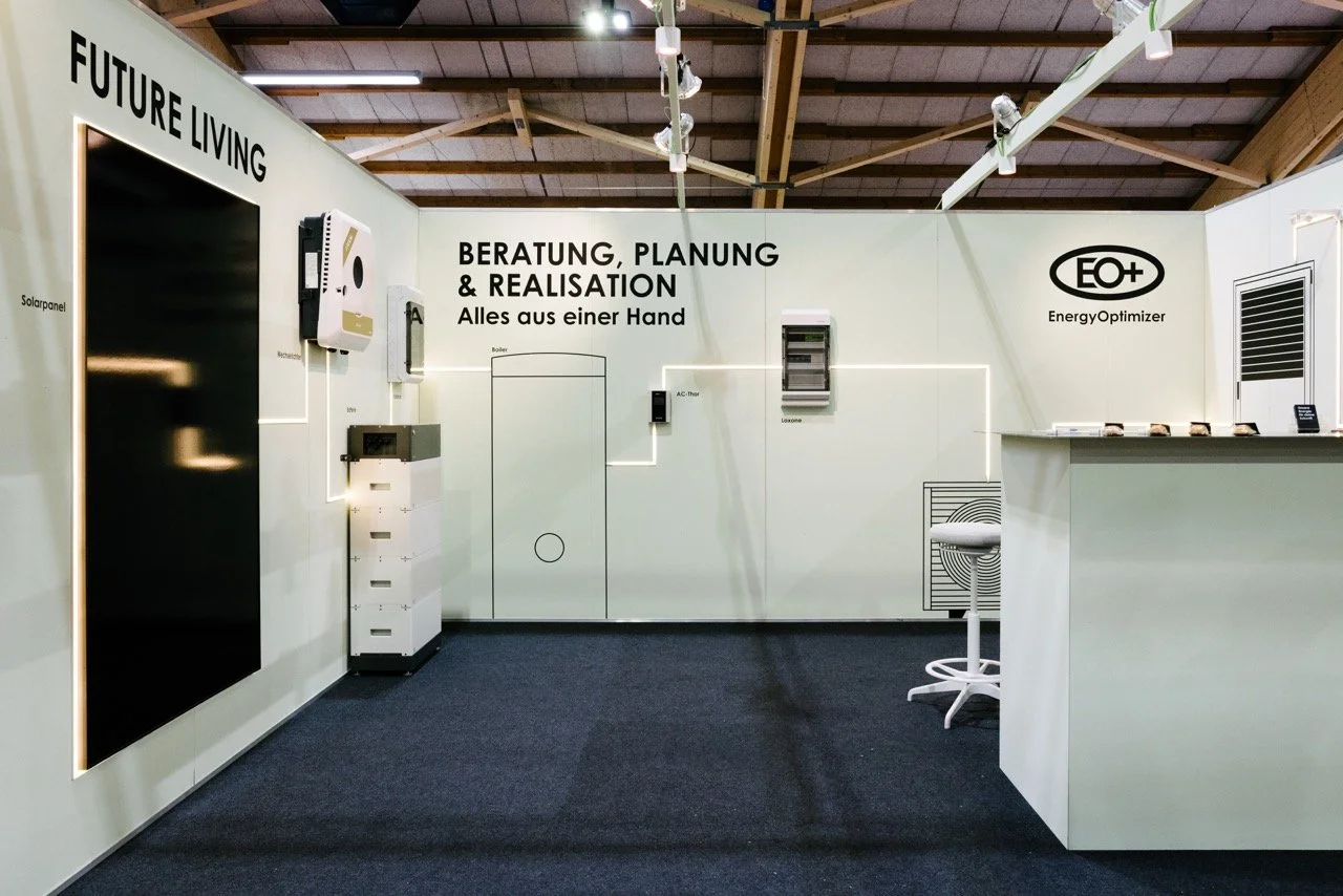 Für Energy Optimizer aus Pieterlen haben wir einen Messestand entwickelt, der den Energiefluss von der Sonne bis zur Nutzung visuell erlebbar macht. Ein Lichtband symbolisiert die Energie, die durch alle Geräte fliesst – von der Solaranlage bis zur Ladestation. So wird deutlich, dass Energy Optimizer komplette Energielösungen anbietet. Als Giveaways gab es Mandelbärli, Visitenkarten und Schwedenmeter. Ein besonderes Highlight war der Tisch, der aus einem defekten Solarpanel gefertigt wurde und damit die nachhaltige Philosophie des Unternehmens unterstreicht. Energy Optimizer begleiten wir seitdem in allen grafischen und strategischen Fragen und bauen gemeinsam an einem visuell wirkungsvollen Gesamtkonzept.